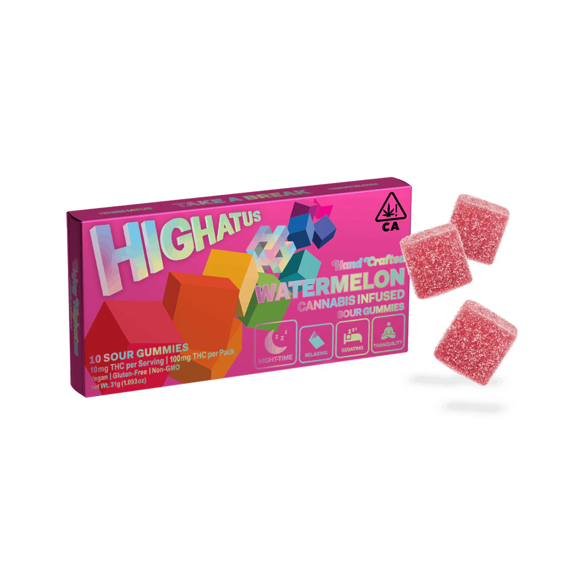 10mg THC per gummy - Indica Infused with THC and a soothing Indica blend, our Watermelon gummy is intended for those seeking a tranquil escape full of inspiration and calm. Melt your stress away with this classic sour gummy flavor that makes for the perfect nightcap!