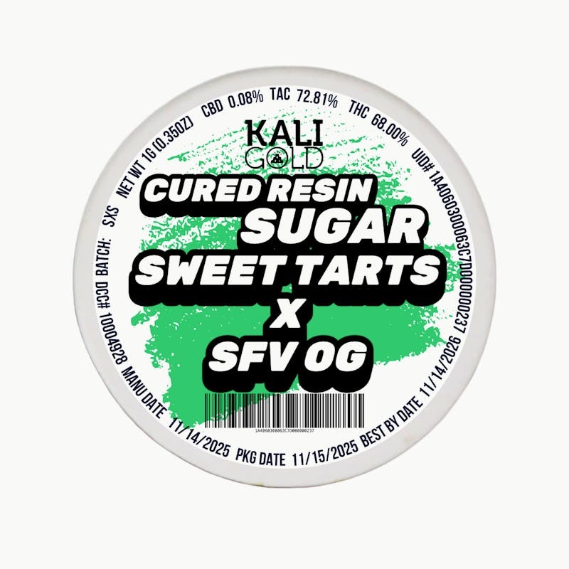 Flavors: Berry Candy · Citrus Diesel · Pine // This flavorful cross blends Sweet Tarts’ sugary berry sweetness with the classic pine-diesel punch of SFV OG, creating a bright yet grounding profile. Expect a balanced experience: a cheerful cerebral lift paired with a smooth, calming body buzz. Perfect for daytime clarity, creative projects, or easing stress while staying functional.