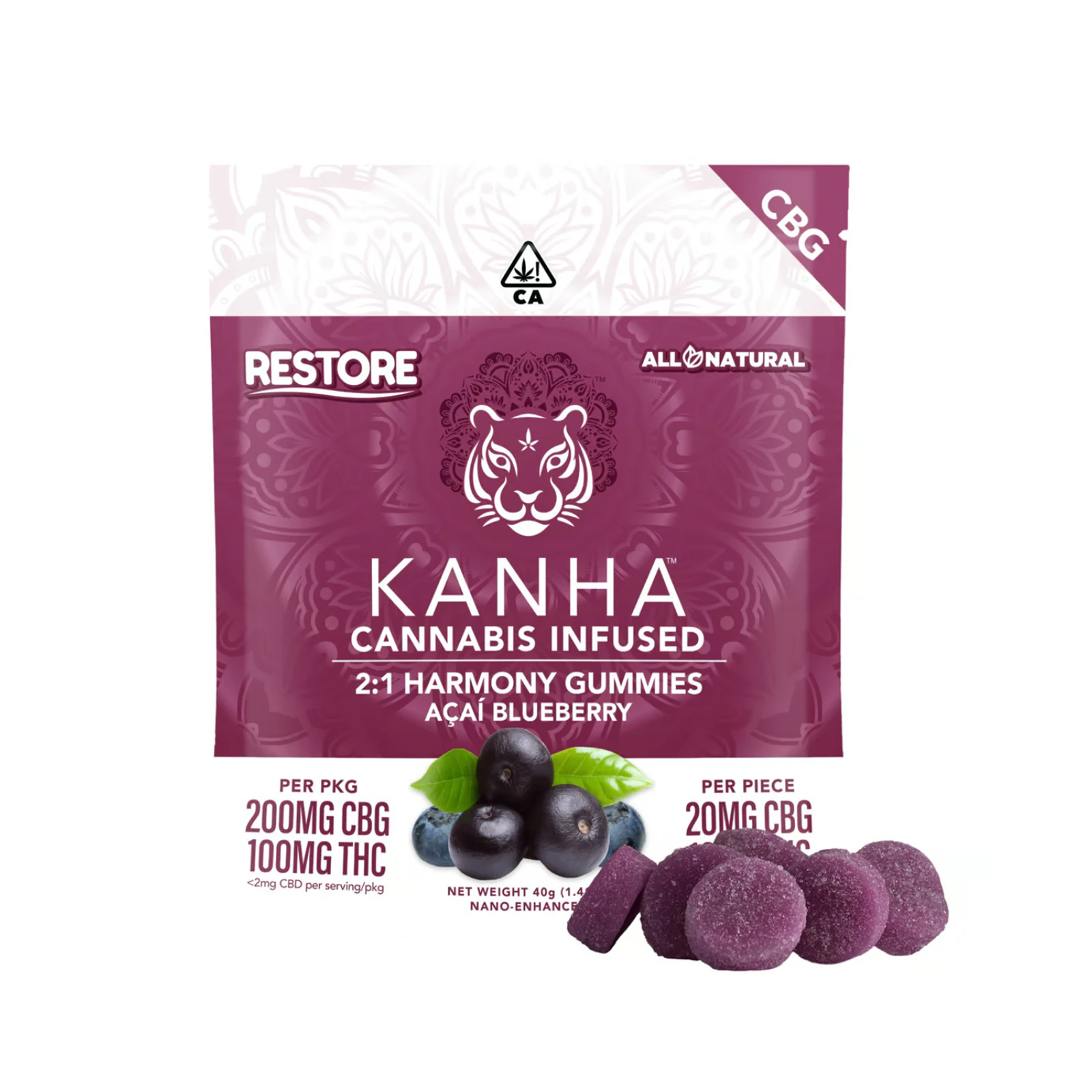 Made with real blueberry and açaí flavors, Harmony Restore delivers 20mg of CBG and 10mg of THC in each tropical gummy, boosted by our exclusive NANO technology for better absorption and faster onset times. CBG, the "mother cannabinoid" and stem cell equivalent in cannabis, is a rare compound that serves as the botanical source for THC, CBD and other cannabinoids. As one of the leading CBG products anywhere, Harmony Restore refreshes the body and soul with generous cannabinoid content and hybrid terpenes like α-humulene, β-caryophyllene and myrcene.