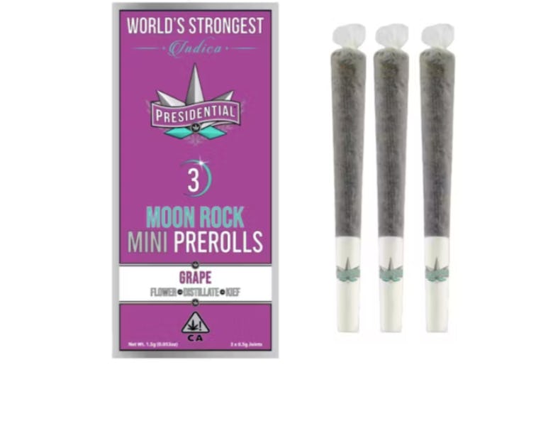Pre-rolls in this 3-pack of 1.5g Grape flavored Moonrock Infused joints weigh .5 grams apiece. Presidential provides you with top-shelf flower, premium kief, and THC distillate with a peachy mango blend flavor. You only need Presidential's Moon Rock-infused joints to make your summer weekend enjoyable. To provide the smoothest possible hits, they are carefully rolled, filled with the finest top-shelf flower, and furnished with a chlorine-free filter. These high-end joints are NEVER rolled, sprayed, or dipped and ALWAYS contain quality distillate and kief. These Presidential pre-rolls are recommended for those who have a high tolerance or are looking for a good time since they will transport you to the moon and back.