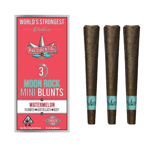 Your Presidential Blunt consists of Top-Shelf Organic Flower INFUSED with Premium THC Distillate and then Coated in the Highest Quality Kief. Our innovative proprietary infusion process enables us to permeate the flower all the way to the stem! Our Moonrocks our ground and wrapped in a 100% tobacco FREE blunt wrap! Presidential is committed to creating the most innovative, highest quality cannabis products guaranteed to deliver a reliable and consistent dose with each use.
