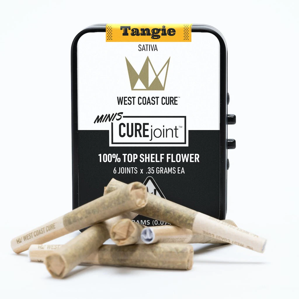 The Tangie CUREjoint .35g mini prerolls are a Sativa dominate smoke with a toothsome flavor. A hybrid cross of an old-school Skunk and California Orange, these mini joints excrete a fragrant citrus aroma that influences the palate, stimulates the taste buds, and motivates the mind. Enjoy exploring nature or the nightlife scene discreetly and safely! Created as a single-use, one-toker joint, the Tangie .35g mini prerolls provide better portion control, consumer safety, and dosage. A thought-provoking smoke with a delicious kick, The Cured Tangie Joint from West Coast Cure is a well-balanced strain that works nicely morning, noon, or night.